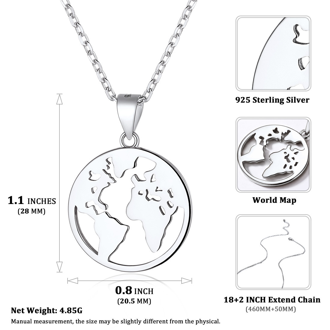 ChicSilver World Map Necklace Earth Charm Round Disc Pendant Necklace 925 Sterling Silver