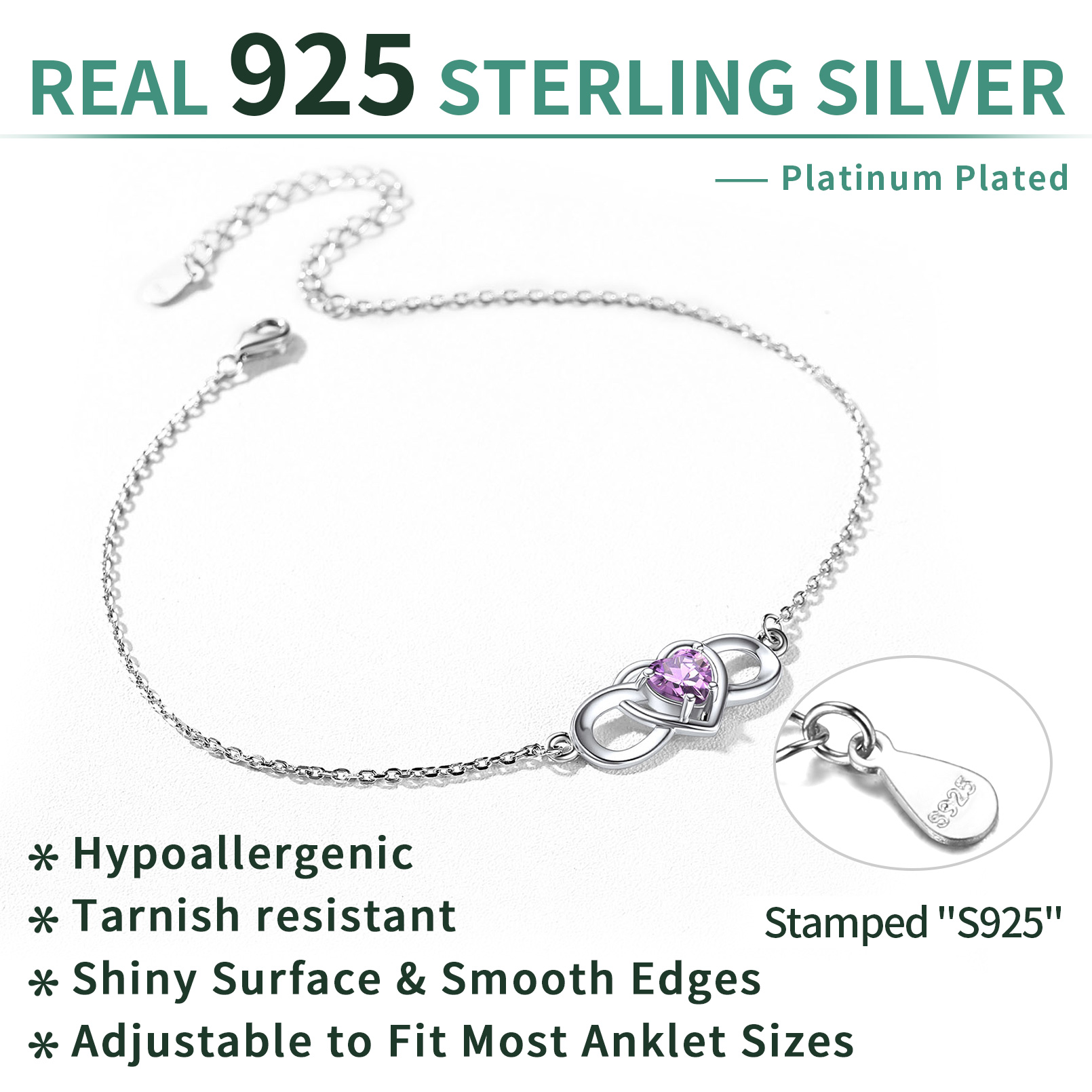 HYPOALLERGENIC MATERIAL- These women anklet are made of high quality 925 sterling silver and sparkling simulated Garnet, lead free & nickel free & anti-allergy, safe for sensitive skins. Unlike cheap metal anklets, sterling silver anklets won't tarnish, turn green or fade.