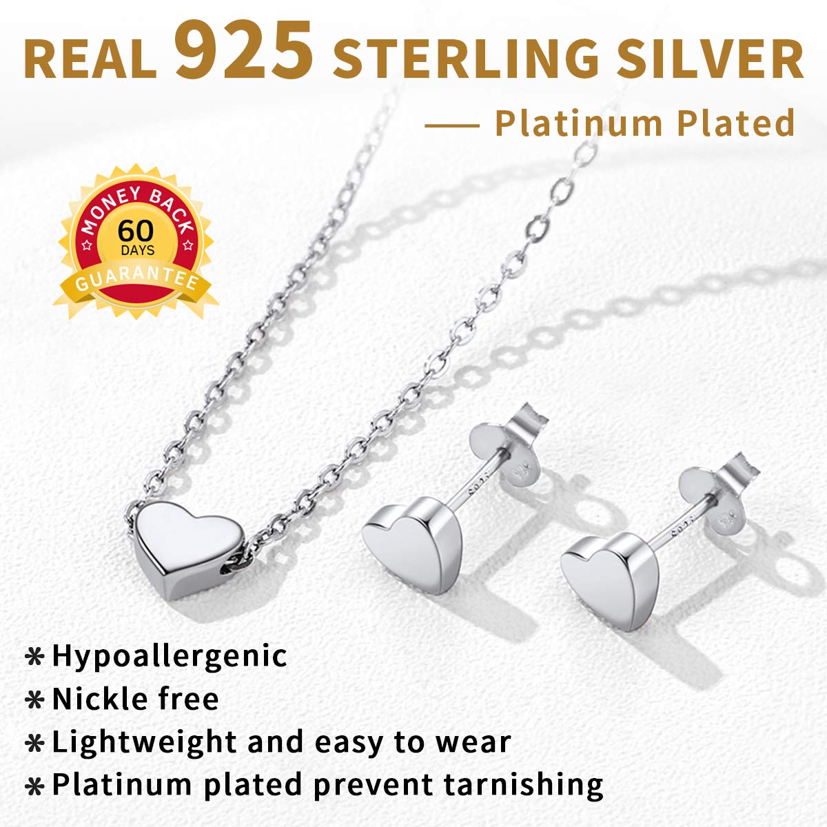 [925 STERLING SILVER EARRING AND NECKLACE] This womens jewelry set is made of hypoallergenic platinum plated sterling silver, passed strict skin test grants allergy free, nickel-free, these sterling silver pendant necklace and stud earring sets are safe for sensitive skin.