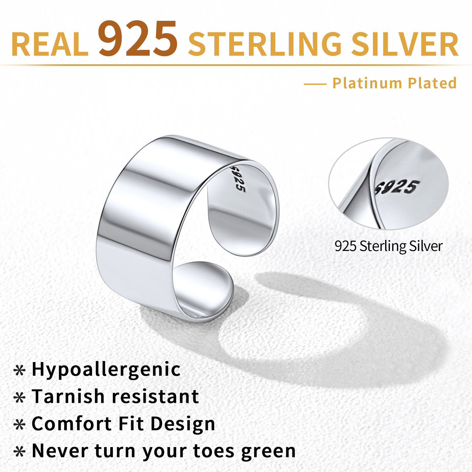 8 mm Band with smooth surface design, comfort fit, retain the perfectly round shape, which won't hurt your toes or finger. But also delicate, please adjust it lightly. Real 925 sterling silver rings, hypoallergenic and not fading (not turning your toes into green)