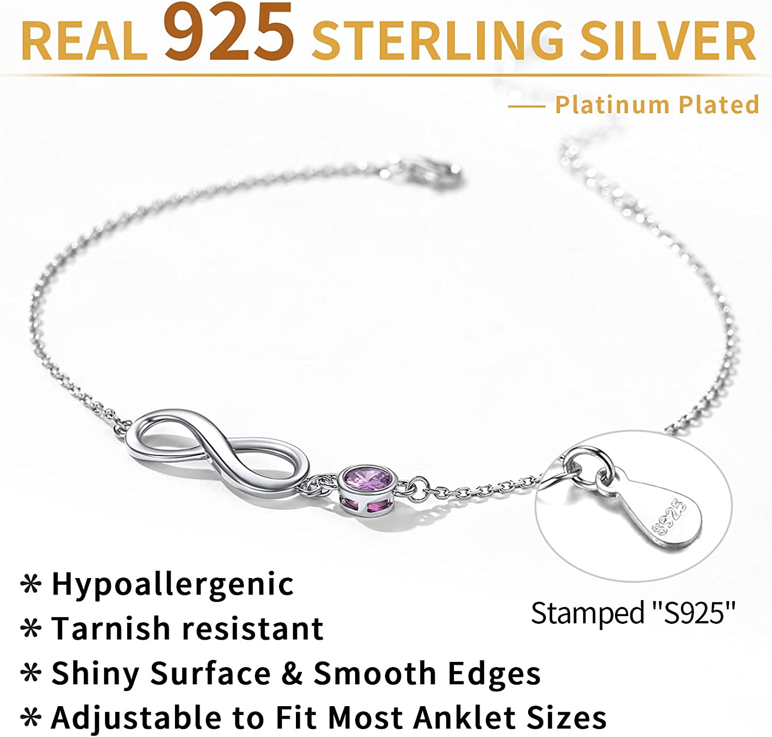ChicSilver adjustable infinity anklet stands for eternal love, friendship and fidelity. Colored round stone makes the infinity anklet more attractive and eye-catching. As a versatile accessory, this cubic zirconia anklet will add some sparkles to daily outfits. Wearing it alone, or paring it with other women??s anklets can bring you a touch of style. Genuine 925 sterling silver jewelry for women is hypoallergenic. It is suitable for sensitive skins and comfortable to wear. Wrapped in a beautiful gift box, it is an ideal jewelry gift for mom, wife, girlfriend, daughter, friend or niece. You can make it a sparkling present for birthday, anniversary, graduation, Valentine??s Day, Mother??s Day or Christmas.