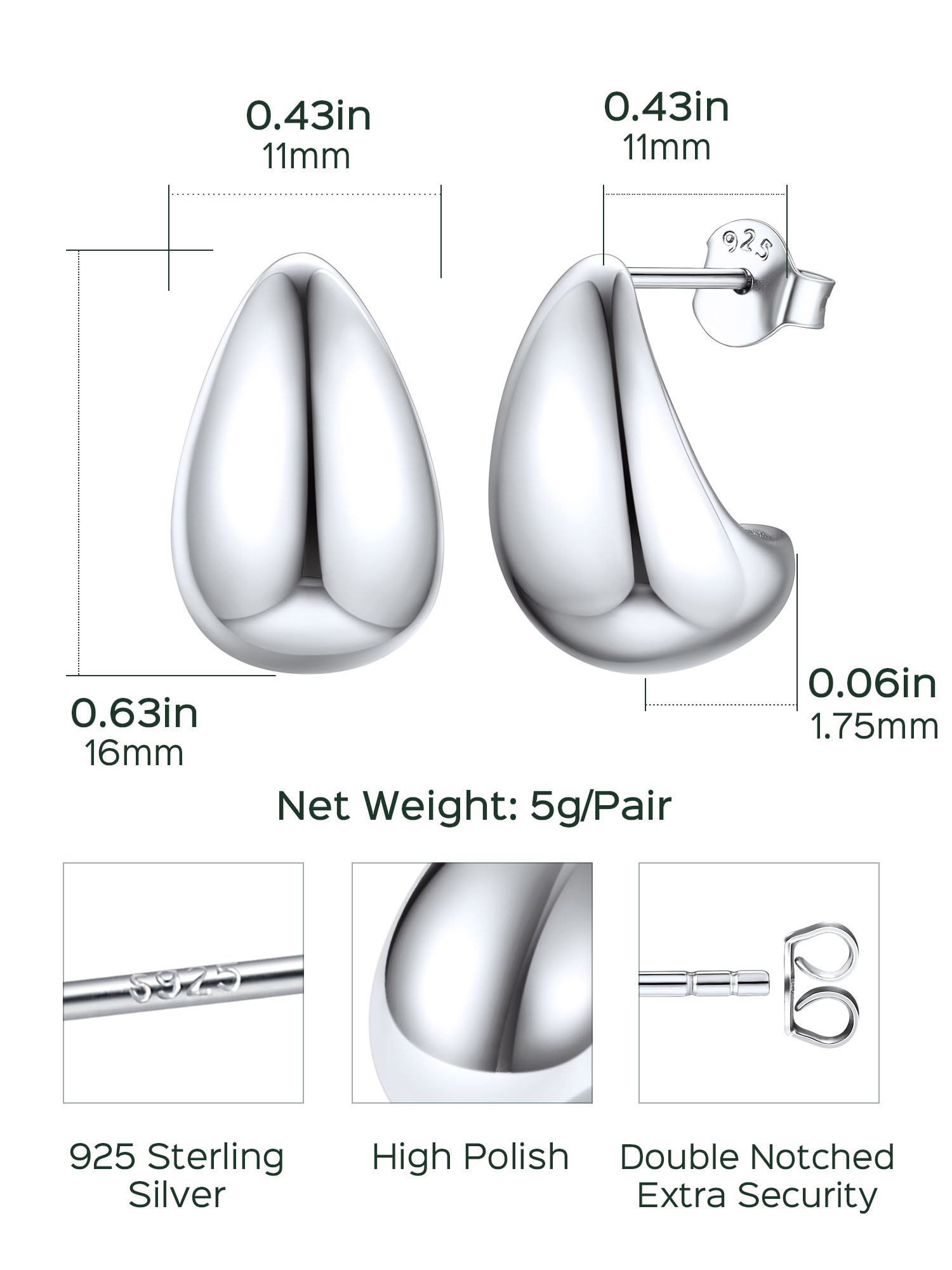 Sterling Silver Earrings for Women Girls -- Waterdrop Earrings Size: 0.43 inches x 0.63 inches. Net Weight: 5g/pair. This trendy lightweight earrings with silver butterfly backs are easy to put on and take off, wouldn't burden your ear.